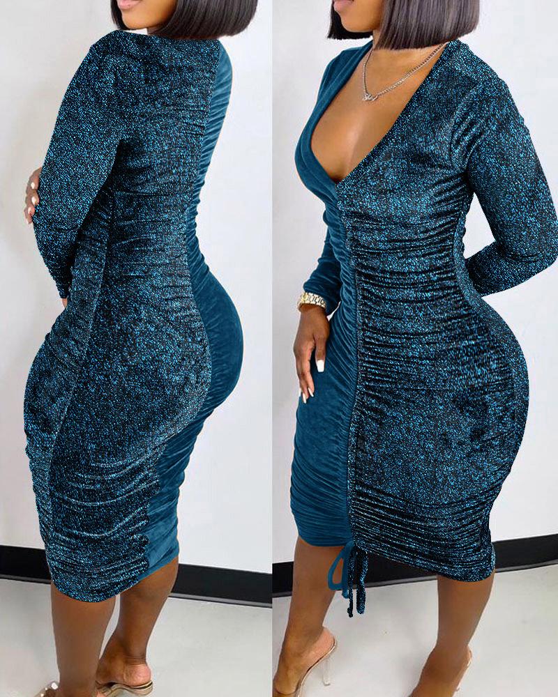 Style:Chic,Sexy Type:Bodycon Material:97%Polyester,3%Spandex Neckline:Plunge Sleeve Style:Long Sleeve Length:Mid-Calf Pattern Type:Plain Decoration:Drawstring,Ruched Fit Type:Skinny Occasion:Night Out,Party Package Include:1* Dress