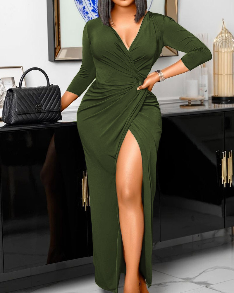 Style:Chic,Glamorous Type:Slit,Wrap Material:97%Polyester,3%Spandex Neckline:V-Neck Sleeve Style:Long Sleeve Length:Maxi Pattern Type:Plain Decoration:Slit Fit Type:Regular Occasion:Party Package Include:1* Dress