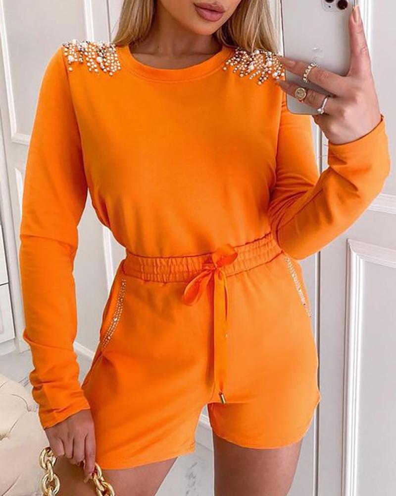 Beaded Rhinestone Decor Top & Drawstring Shorts Set