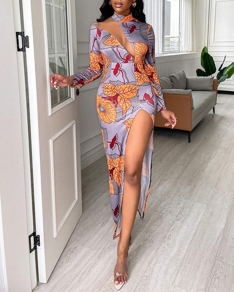 Floral Print Cutout Split Thigh Long Sleeve Maxi Dress