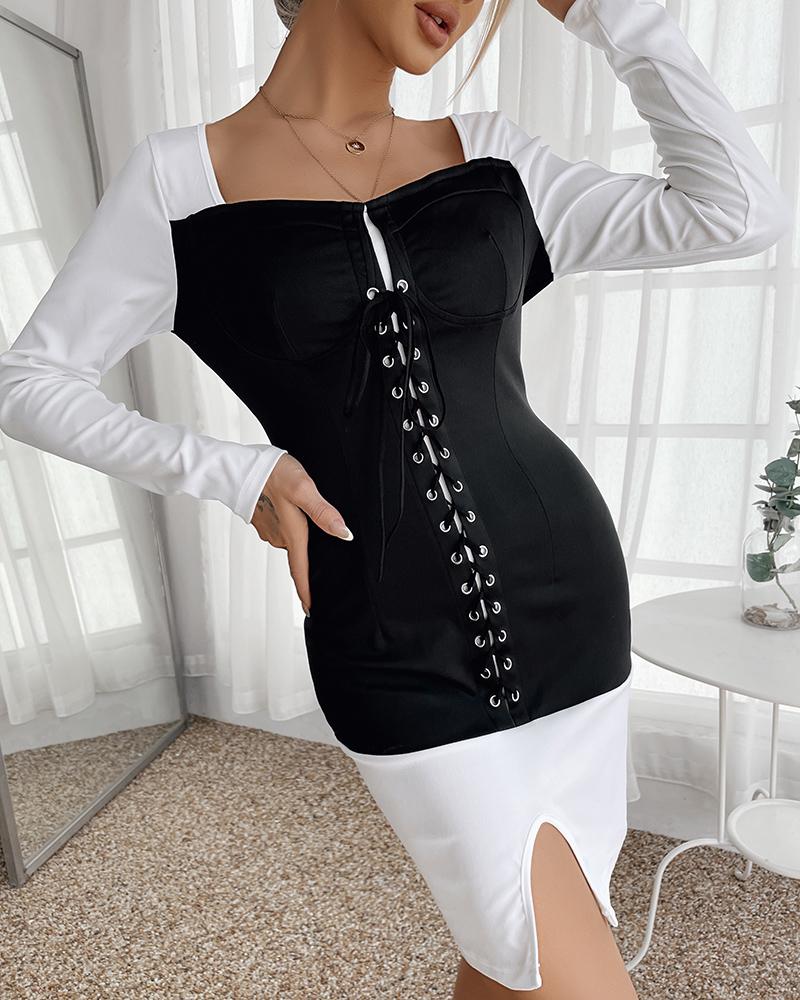 Colorblock Eyelet Lace Up Slit Bodycon Dress