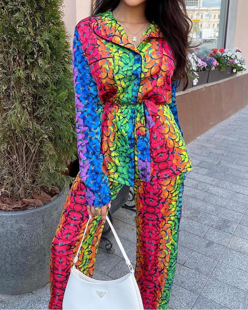 Style:Casual Type:Pajamas Set Material:100%Polyester Neckline:Turn-down Collar Sleeve Style:Long Sleeve Length:Long Pattern Type:Butterfly,Colorblock Fit Type:Regular Occasion:Home Package Include:Pajamas Set