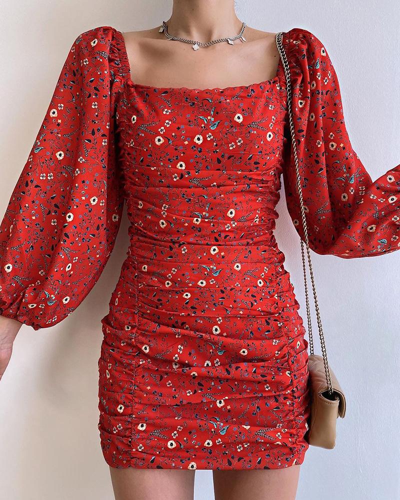 Style:Boho,Chic Type:Bodycon Material:100%Polyester Neckline:Square Neck Sleeve Style:Lantern Sleeve,Long Sleeve Length:Mini Pattern Type:Ditsy Floral Fit Type:Skinny Occasion:Daily Package Include:1* Dress
