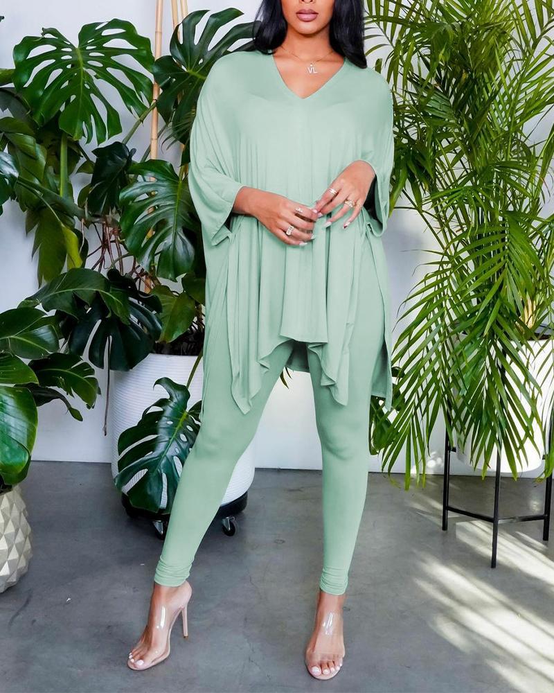 Asymmetrical Split Hem V-Neck Top & Pants Set