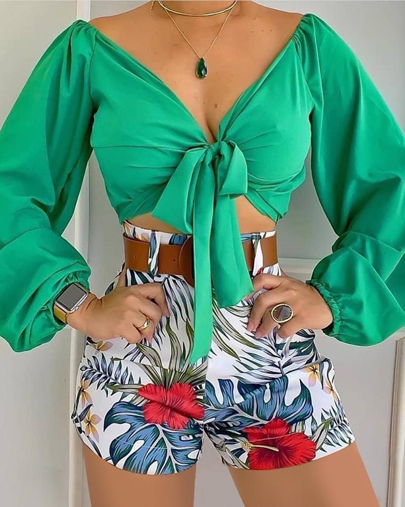 V-Neck Top & Tropical Print Tied Detail Shorts Set