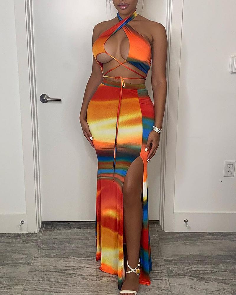 Style:Chic Type:Skirt Sets Material:97%Polyester,3%Spandex Neckline:Halter Sleeve Style:Sleeveless Length:Maxi Pattern Type:Abstract Decoration:Slit Fit Type:Skinny Occasion:Daily Package Include:Skirt Sets