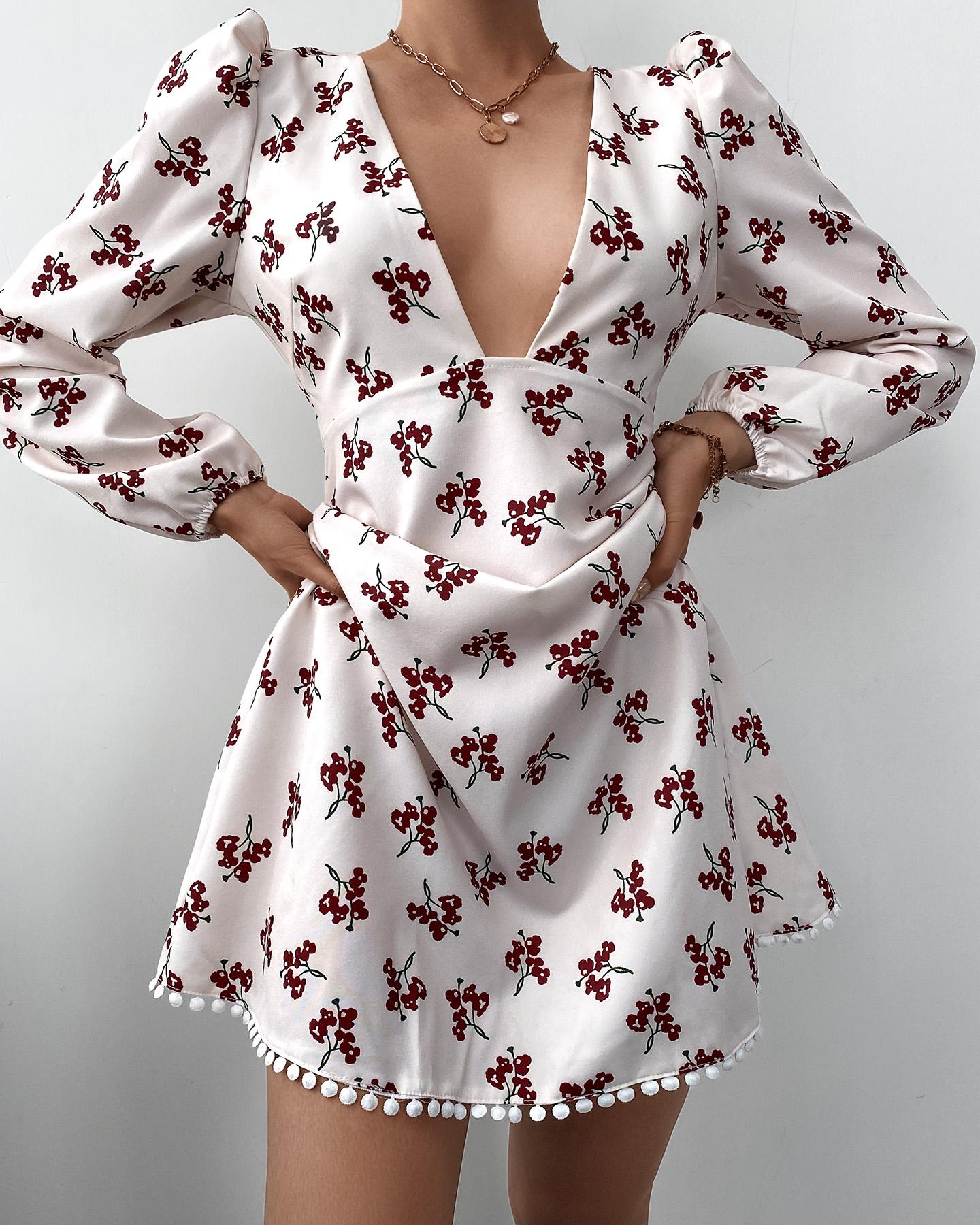 Style:Casual,Chic Type:A Line Material:97%Polyester,3%Spandex Neckline:Plunge Sleeve Style:Long Sleeve,Puff Sleeve Length:Mini Pattern Type:Ditsy Floral Decoration:Puff Sleeve,Contrast Lace Fit Type:Regular Occasion:Daily Package Include:1* Dress