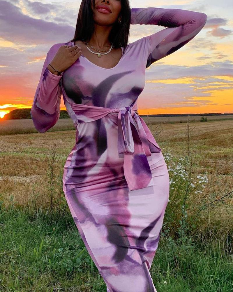 Style:Chic Type:Bodycon Material:97%Polyester,3%Spandex Neckline:Scoop Neck Sleeve Style:Long Sleeve Length:Midi Pattern Type:Abstract Decoration:Tie Front Fit Type:Skinny Occasion:Daily Package Include:1* Dress