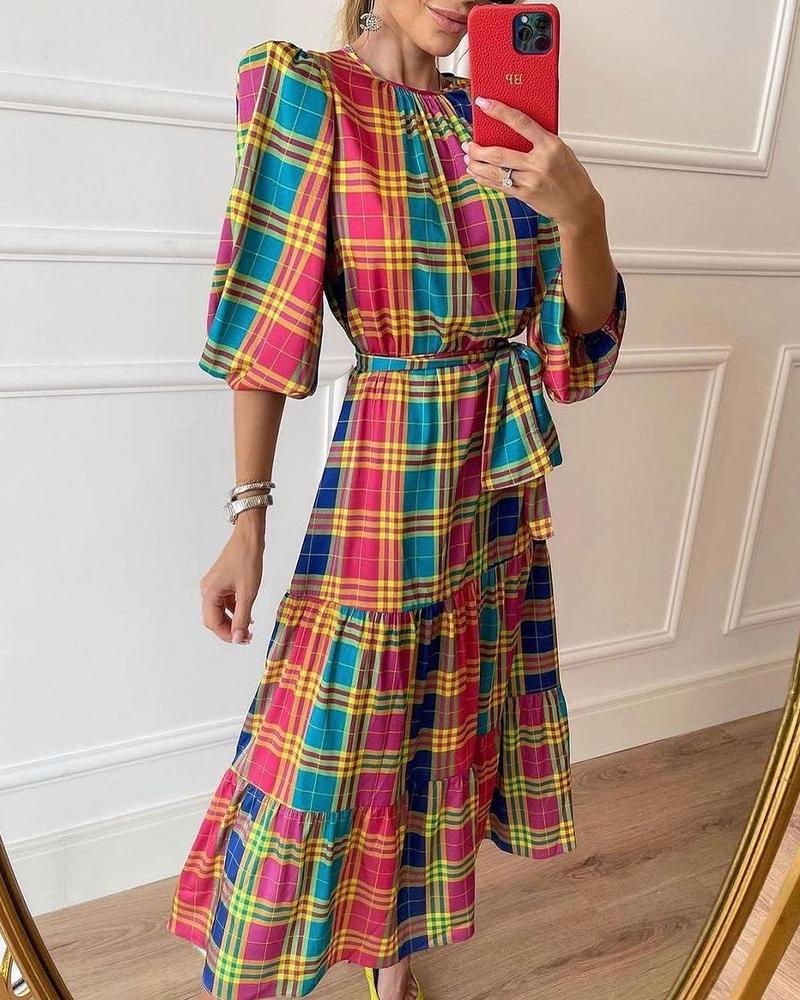Style:Casual,Elegant Type:A Line Material:100%Polyester Neckline:Round Neck Sleeve Style:Half Sleeve Length:Maxi Pattern Type:Plaid Decoration:Ruffle Hem Fit Type:Regular With Belt:Yes Occasion:Daily Package Include:1*Dress(With Belt)