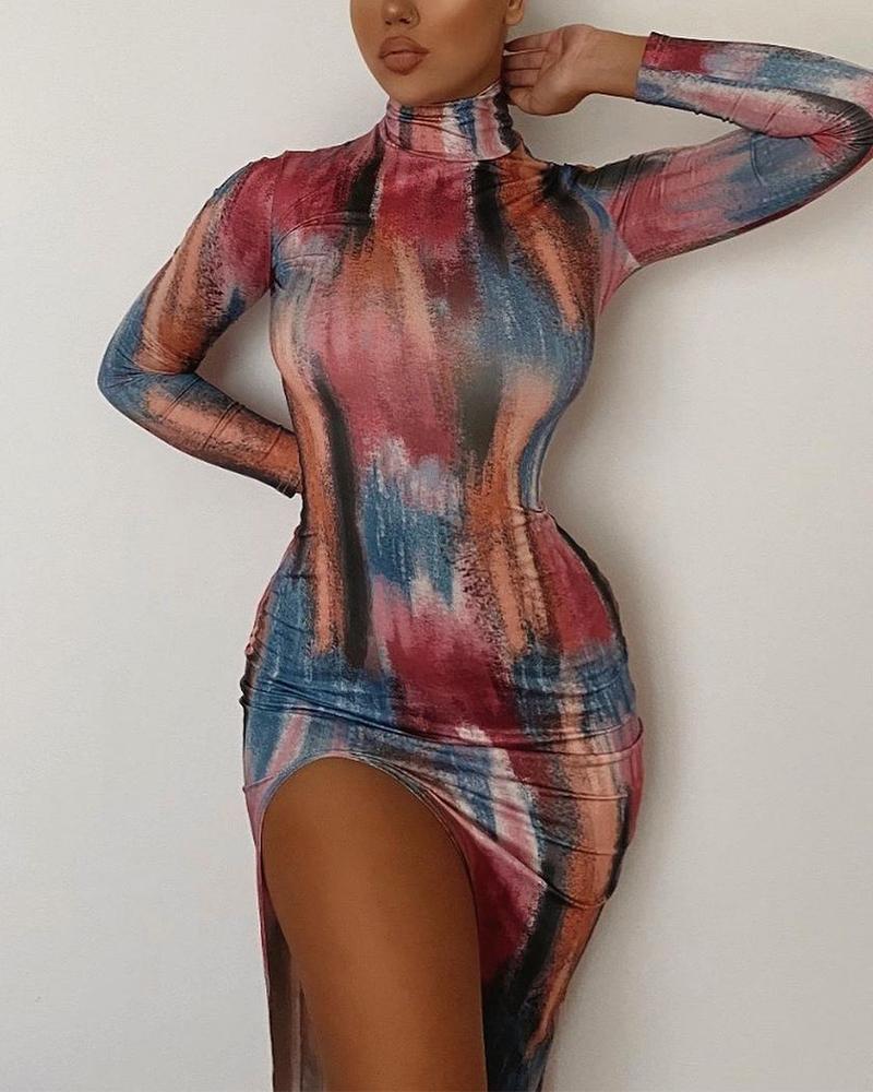 Style:Chic Type:Bodycon Material:97%Polyester,3%Spandex Neckline:High Neck Sleeve Style:Long Sleeve Length:Mid-Calf Pattern Type:Abstract Decoration:Slit Fit Type:Skinny Occasion:Daily,Night Out Package Include:1* Dress