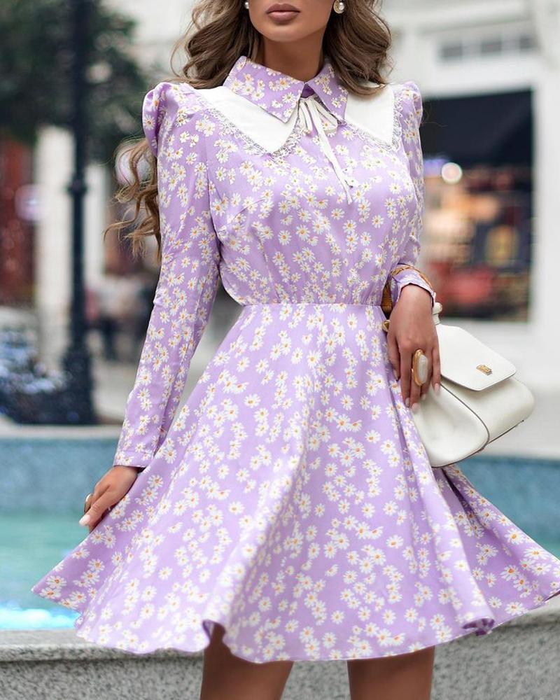 Style:Chic Type:A Line Material:100%Polyester Neckline:Turn-down Collar Sleeve Style:Long Sleeve Length:Mini Pattern Type:Daisy Decoration:Lace Fit Type:Regular Occasion:Daily Package Include:1* Dress