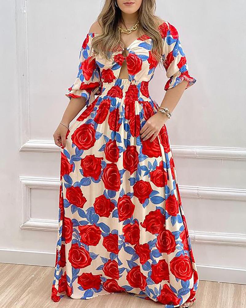 Style:Casual Type:A Line Material:100%Polyester Neckline:Off the Shoulder Sleeve Style:Half Sleeve Length:Maxi Pattern Type:Floral Decoration:Cutout Fit Type:Regular Occasion:Daily Package Include:1* Dress