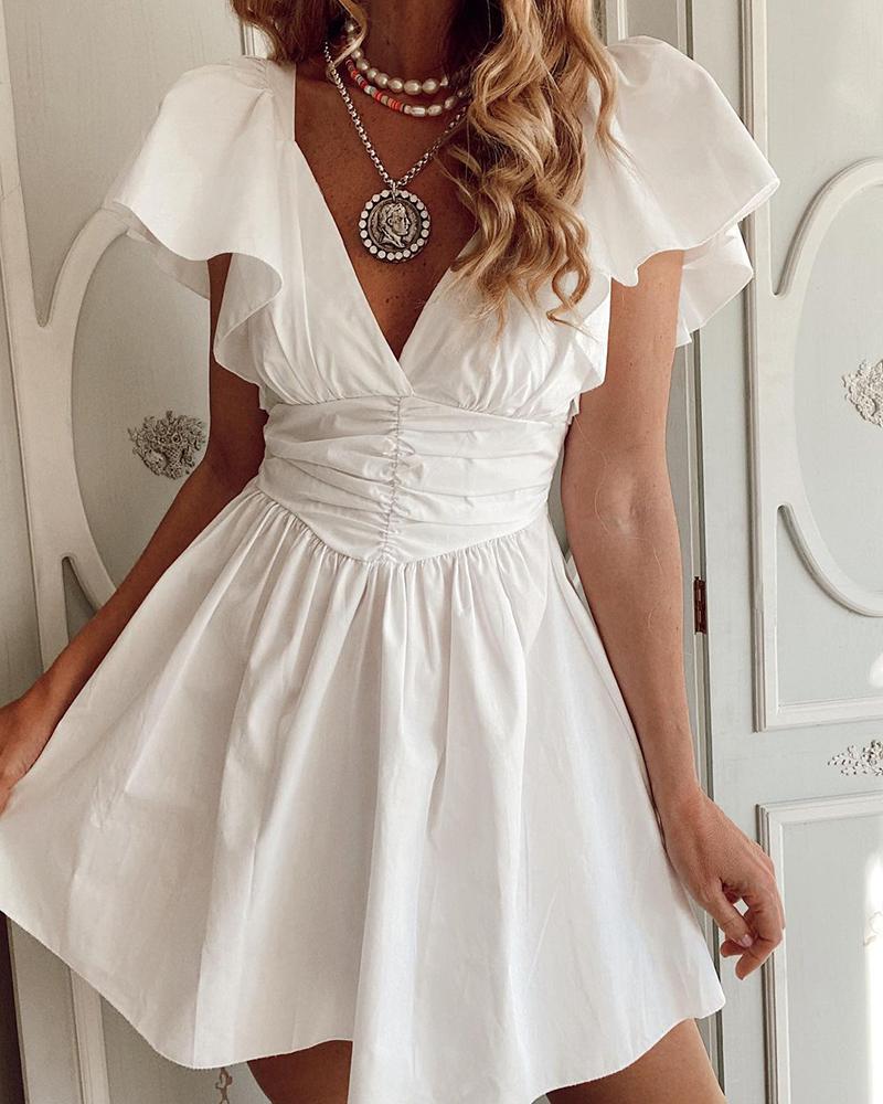 Style:Casual Type:A Line Material:100%Polyester Neckline:V-Neck Sleeve Style:Flutter Sleeve Length:Mini Pattern Type:Plain Decoration:Flutter Sleeve,Ruched Fit Type:Regular Occasion:Daily Package Include:1*Dress