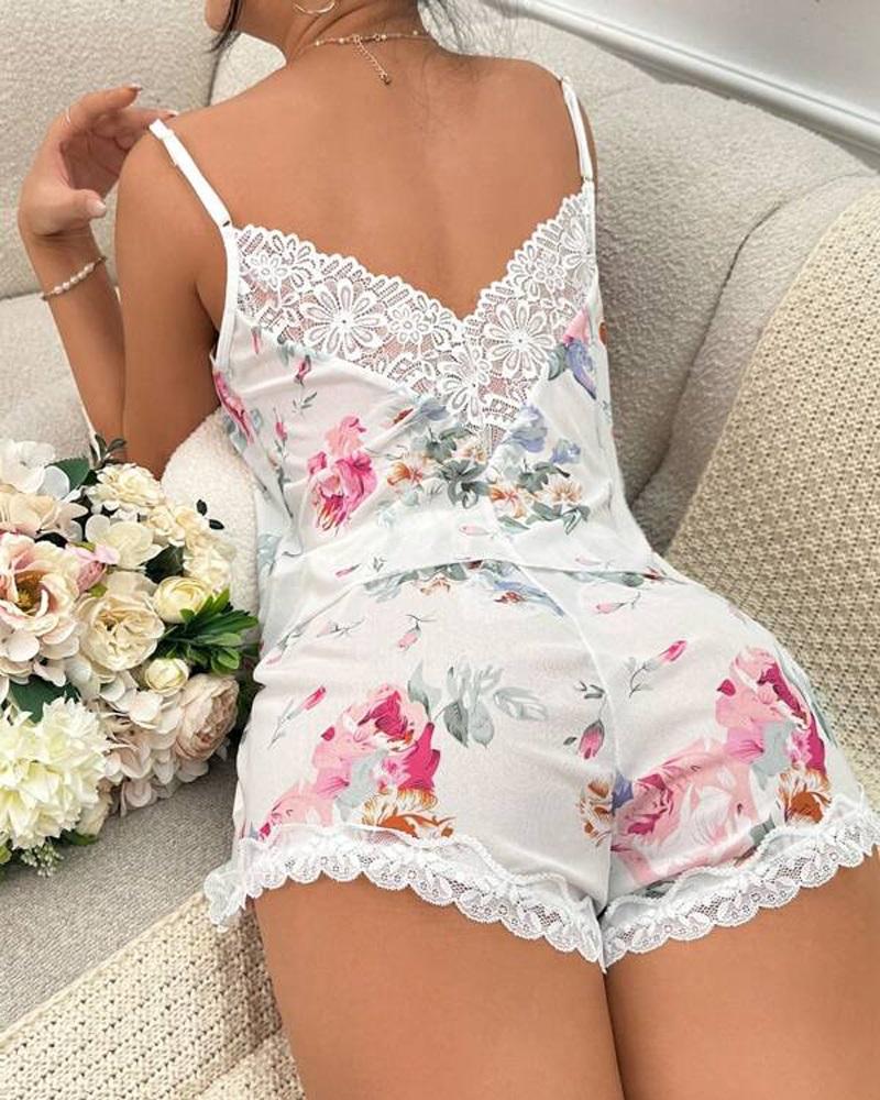 Style:Casual Type:Cami Sets Material:97%Polyester,3%Spandex Neckline:Scoop Neck Sleeve Style:Spaghetti Strap Length:Above Knee Pattern Type:Floral Decoration:Backless,Contrast Lace Fit Type:Regular Occasion:Home Package Include:1*Shorts Set Fabric Elasticity:Slight Stretch Sheer:Semi-Sheer Care Instructions:Machine wash or professional dry clean Waist Line:High Waist