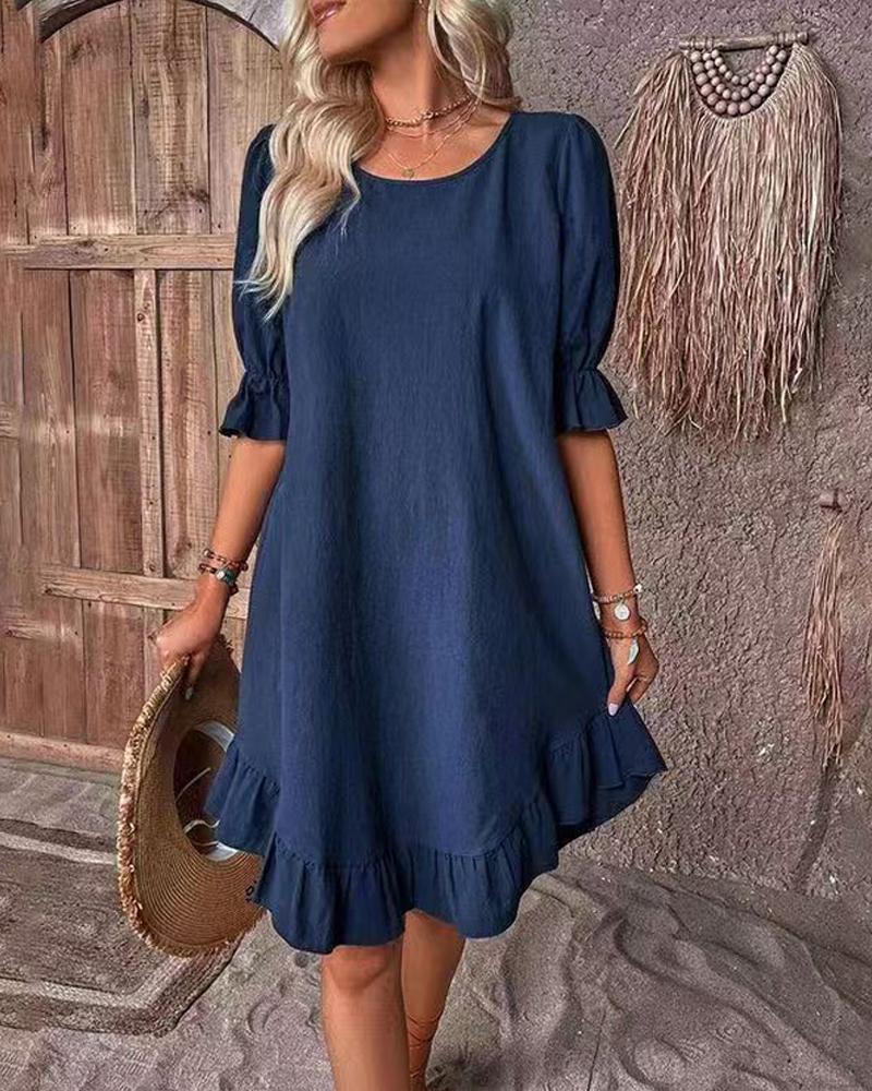 Round Neck Bell Sleeve Ruffle Hem Casual Dress