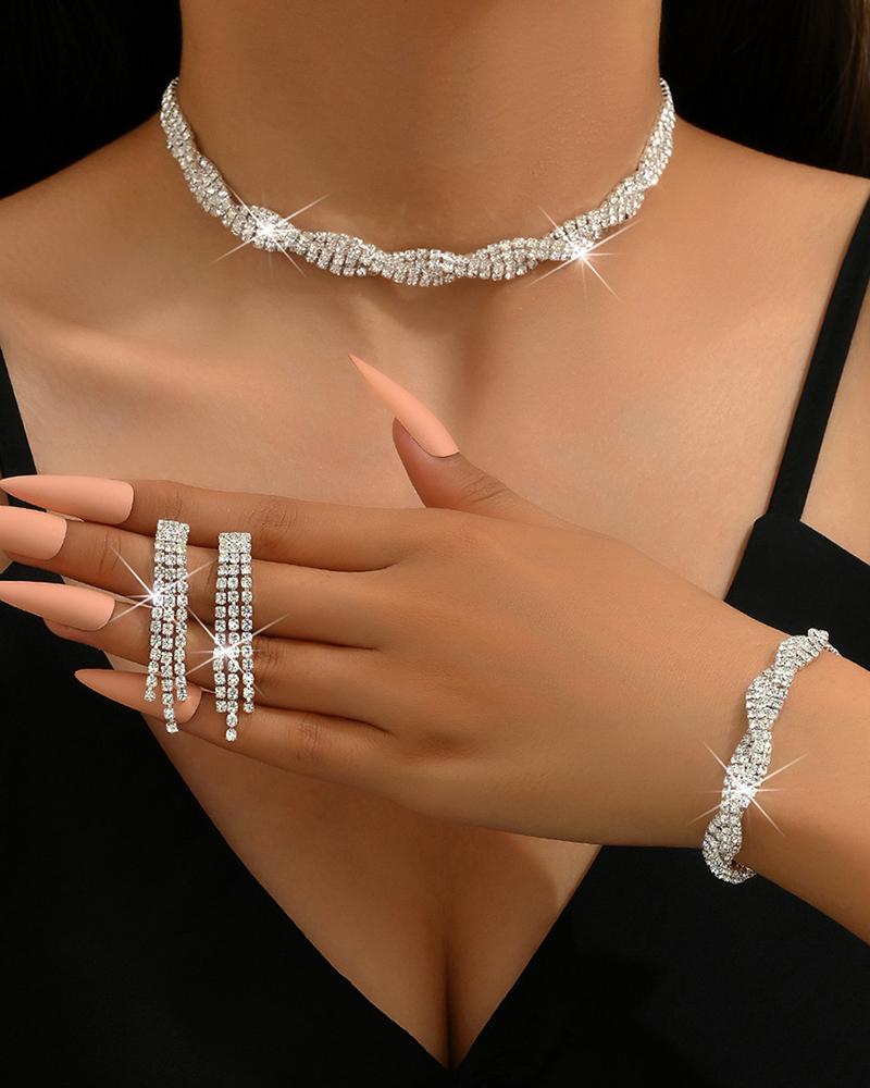 3PCS Twisted Rhinestone Choker & Tassel Drop Earrings & Bracelet Wedding Bridal Jewelry Set