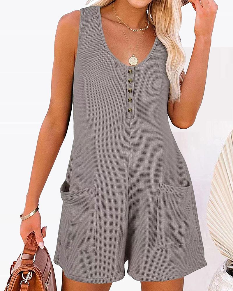 Style:Casual Type:Romper Material:Waffle Knit Neckline:V-Neck Sleeve Style:Sleeveless Length:Above Knee Pattern Type:Plain Decoration:Button,Pocket Fit Type:Oversized Occasion:Daily Package Include:1*Romper Fabric Elasticity:Slight Stretch Sheer:No Care Instructions:Machine wash or professional dry clean
