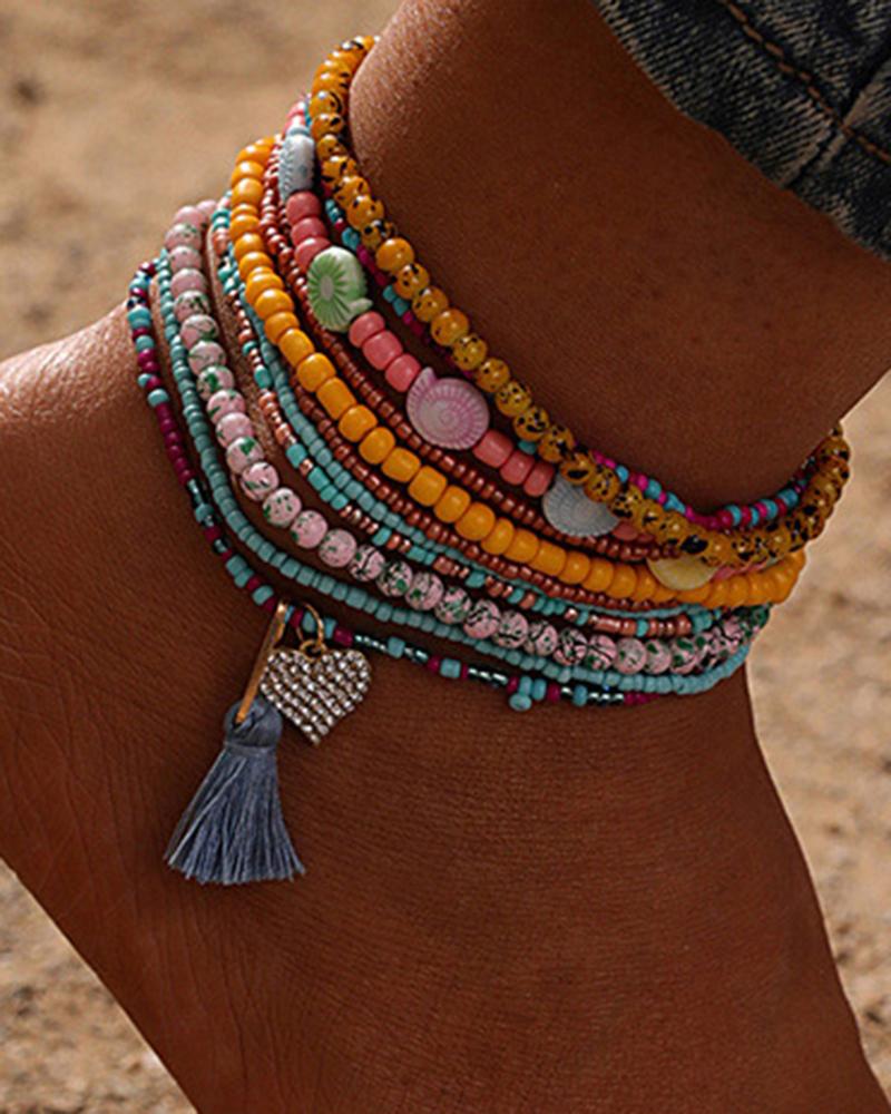 1pcs Stackable Beaded Colorblock Heart Tassel Anklets Set