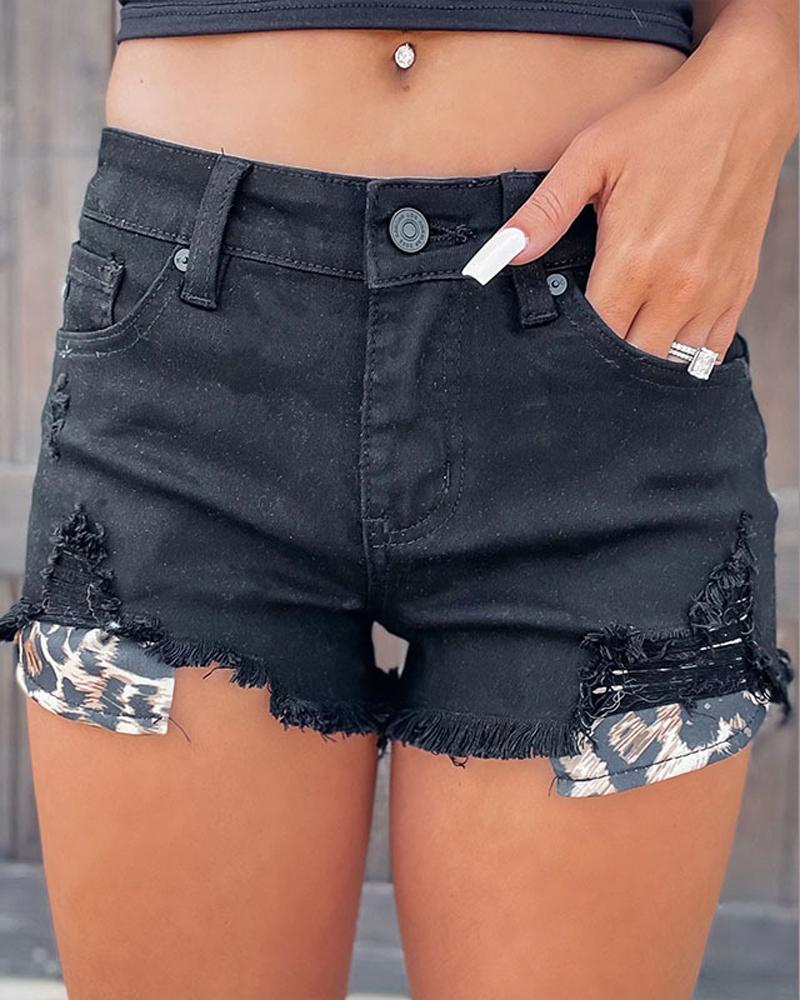 Baseball Leopard Print Patchwork Ripped Denim Shorts