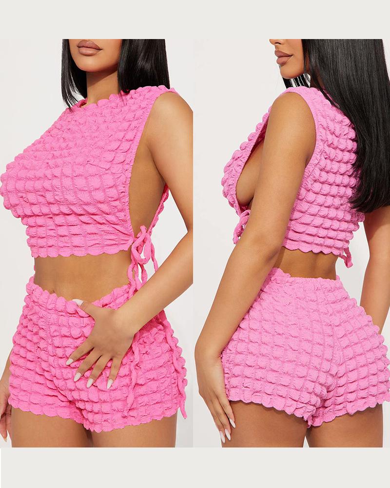 Bubble Textured Tied Detail Crop Top & Shorts Set