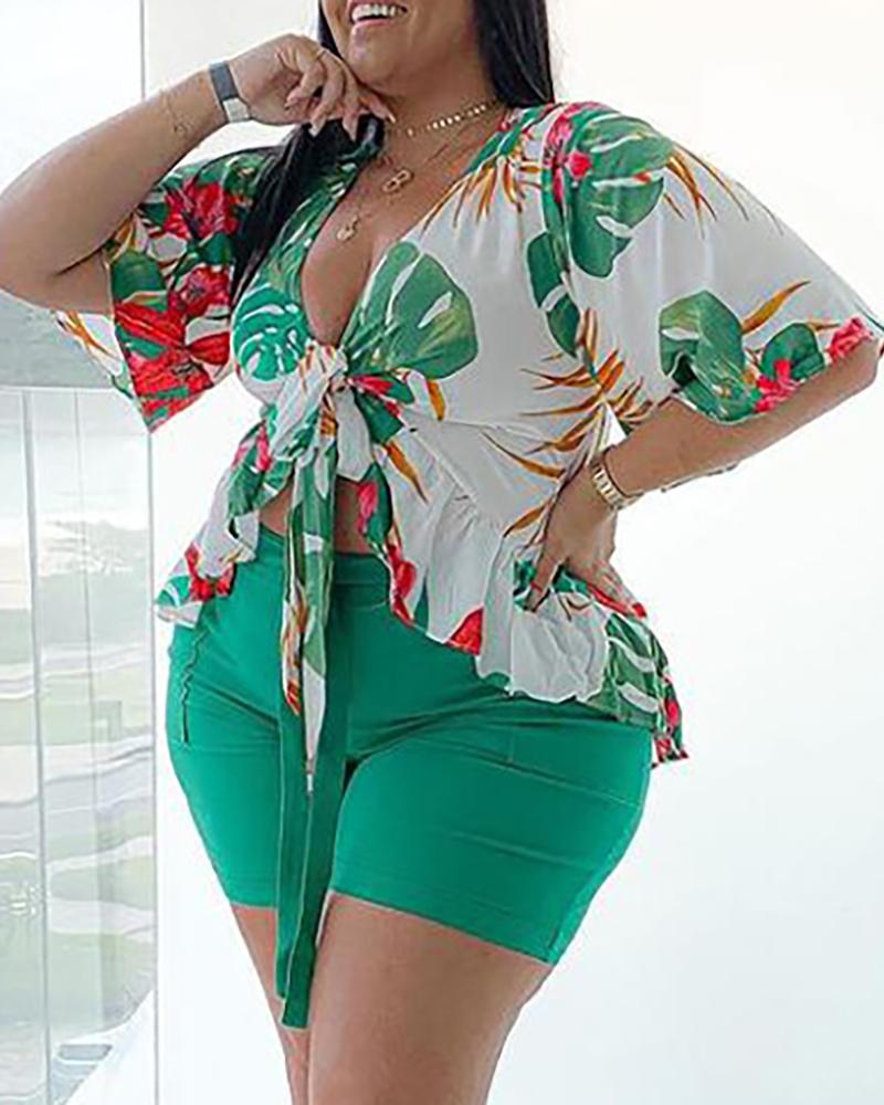 Style:Chic Type:Shorts Set Material:Polyester Neckline:V-Neck Sleeve Style:Half Sleeve Length:Above Knee Pattern Type:Tropical,Plain Decoration:Ruffles,Tie Front Fit Type:Regular Occasion:Vacation Package Include:Shorts Set