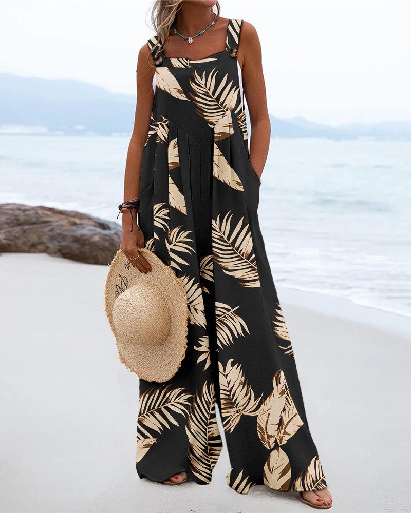 Plants Print Sleeveless Pocket Detail Wide Leg Jumpsuit