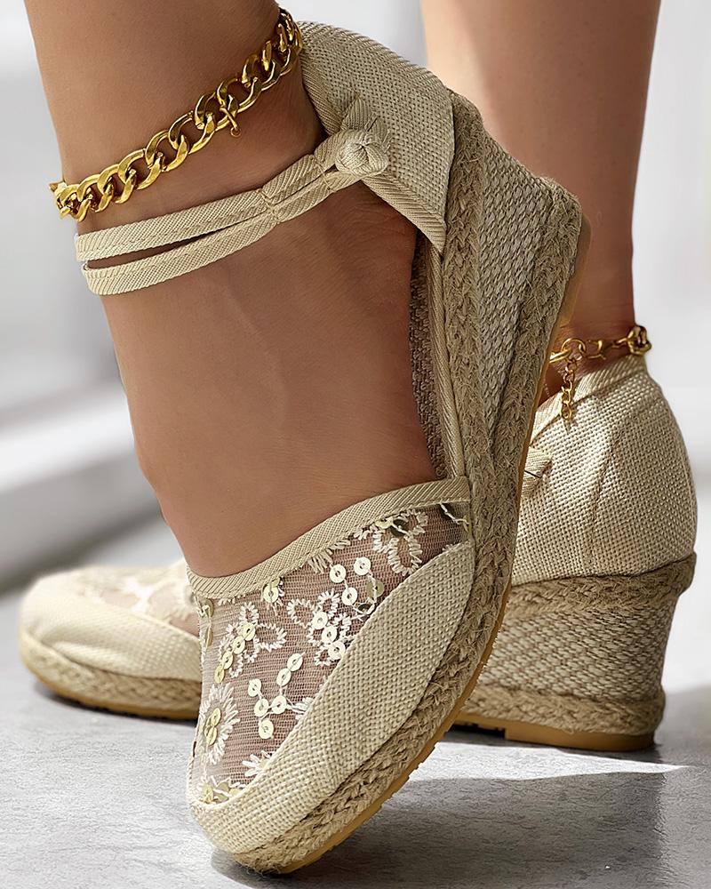 Embroidery Braided Espadrille Ankle Strap Wedge Sandals