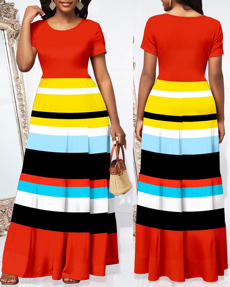 Striped Ruched Short Sleeve Maxi Dress