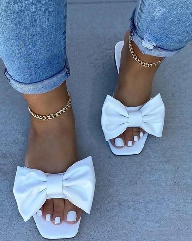 Style:Chic Type:Slippers Material:PU Pattern Type:Plain Decoration:Bowknot Occasion:Daily Toe:Square Toe Heel Height:Flat Package Include:1*Slippers