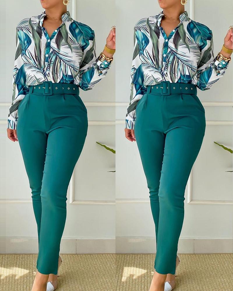 Style:Elegant Type:Pants Sets Neckline:Stand Collar Sleeve Style:Long Sleeve Length:Long Pattern Type:Tropical Fit Type:Regular With Belt:Yes Occasion:Work Package Include:1*Pants Set(With Belt)