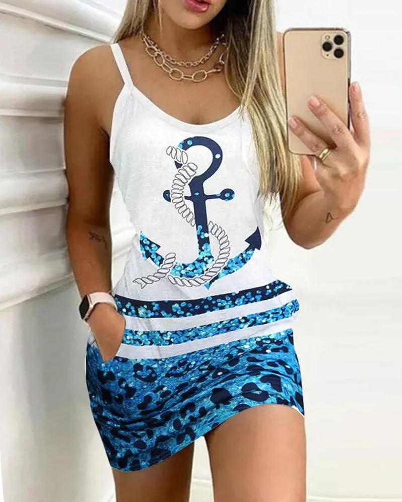 Style:Casual Type:Straight Neckline:V-Neck Sleeve Style:Spaghetti Strap Length:Mini Pattern Type:Anchor,Leopard Decoration:Pocket Fit Type:Regular Occasion:Daily Package Include:1* Dress