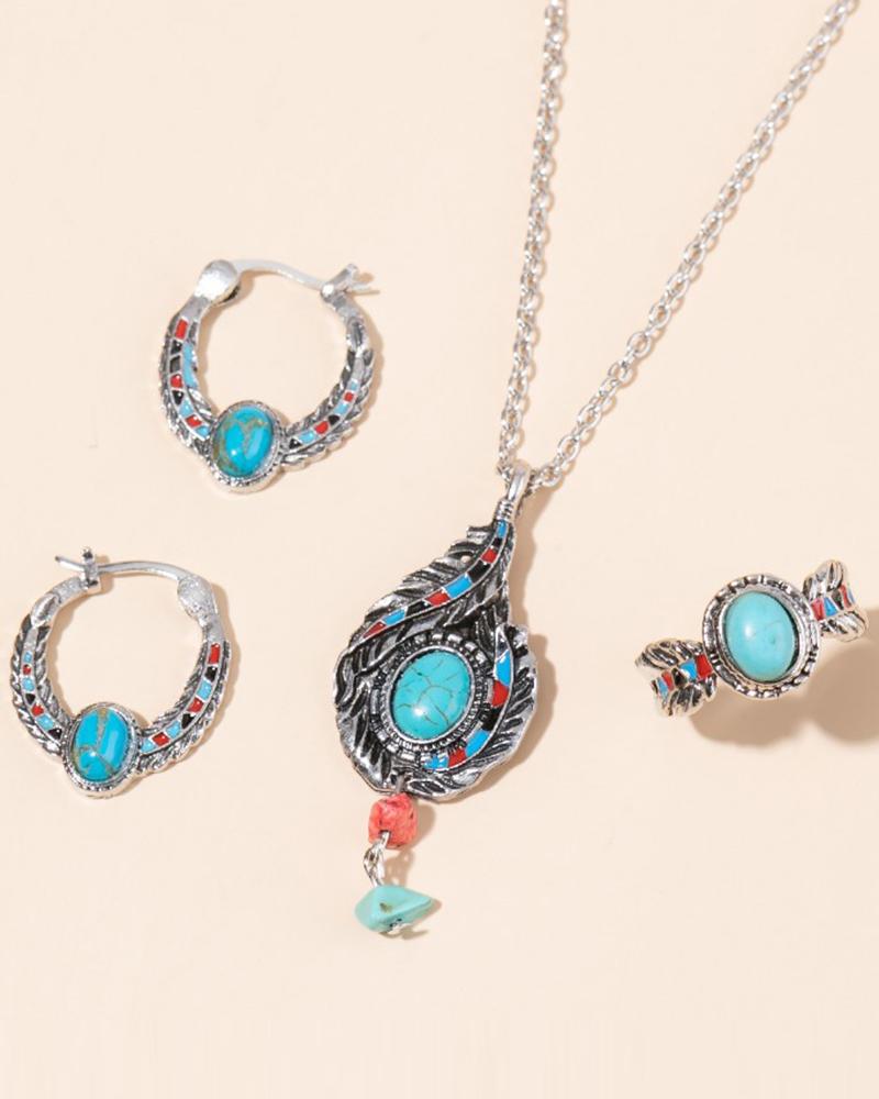 3pcs Feather Turquoise Pendant Necklace & Hoop Earrings & Ring Jewelry Set