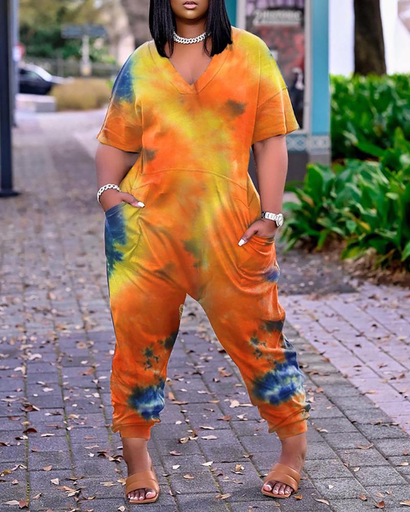 Style:Casual,Chic Type:Jumpsuit Material:Polyester Neckline:V-Neck Sleeve Style:Short Sleeve Length:Long Pattern Type:Tie Dye Decoration:Pocket Fit Type:Regular Occasion:Daily Package Include:1*Jumpsuit