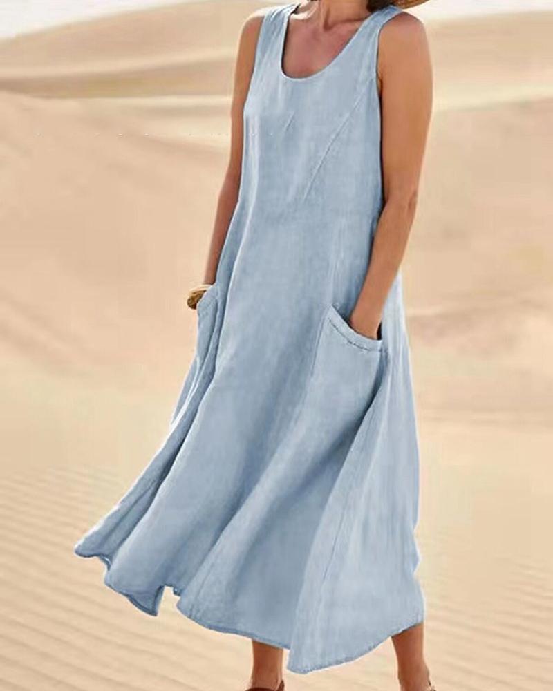 Style:Casual,Chic Type:A Line Material:Polyester Neckline:V-Neck Sleeve Style:Sleeveless Length:Mid-Calf Pattern Type:Plain Decoration:Pocket Fit Type:Regular Occasion:Daily Package Include:1* Dress