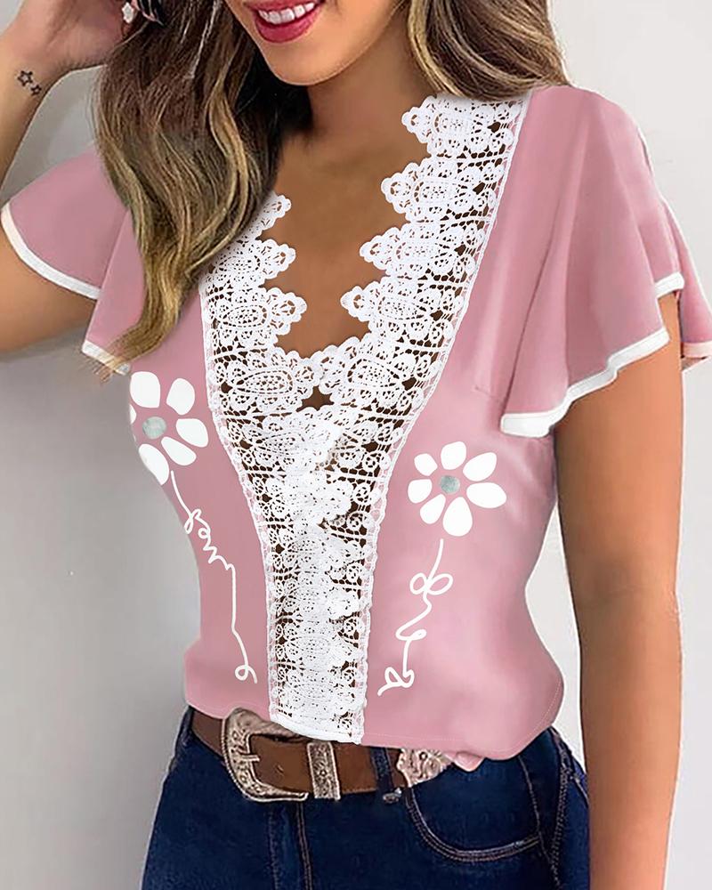 Style:Chic Type:Blouses Material:100%Polyester Neckline:V-Neck Sleeve Style:Cap Sleeve Length:Regular Pattern Type:Contrast Paneled Decoration:Lace Fit Type:Regular Occasion:Daily Package Include:1* Blouse