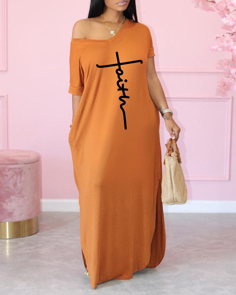 Style:Basics,Casual Type:Slit,Straight,Tee Material:Polyester Neckline:V-Neck Sleeve Style:Short Sleeve Length:Maxi Pattern Type:Letter Decoration:Pastel,Pocket,Slit Fit Type:Regular Occasion:Daily Package Include:1* Dress