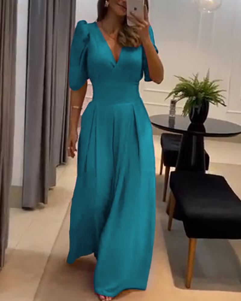 Style:Chic,Elegant Type:Jumpsuit Material:100%Polyester Neckline:V-Neck Sleeve Style:Half Sleeve,Puff Sleeve Length:Long Pattern Type:Plain Decoration:Ruched Fit Type:Regular Occasion:Daily,Wedding Guest,Work Package Include:1*Jumpsuit Fabric Elasticity:High Stretch Sheer:No Care Instructions:Machine wash or professional dry clean
