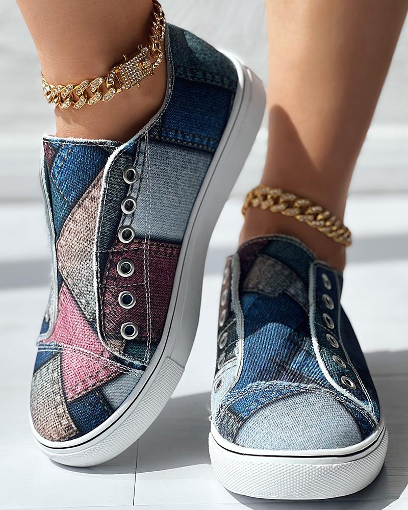 Denim Look Print Eyelet Slip-on Sneakers