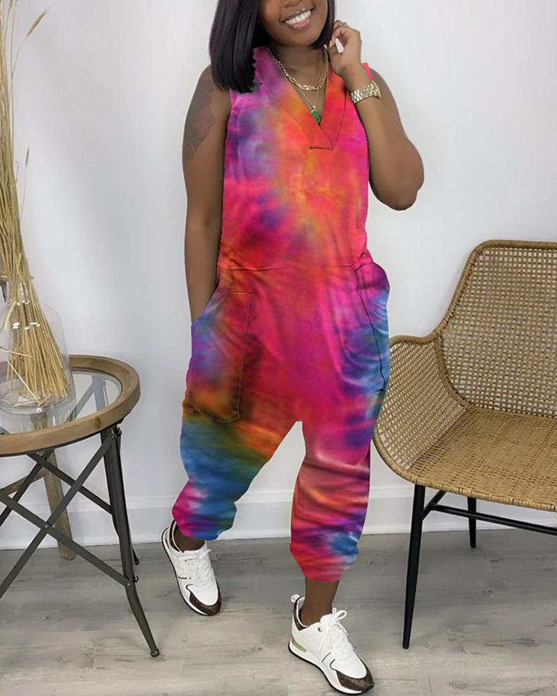 Style:Casual Type:Straight Material:Polyester Neckline:V neck Sleeve Style:Sleeveless Length:Long Pattern Type:Tie Dye Decoration:Cutout Fit Type:regular With Belt:No Occasion:Going Out Package Include:1*Jumpsuit
