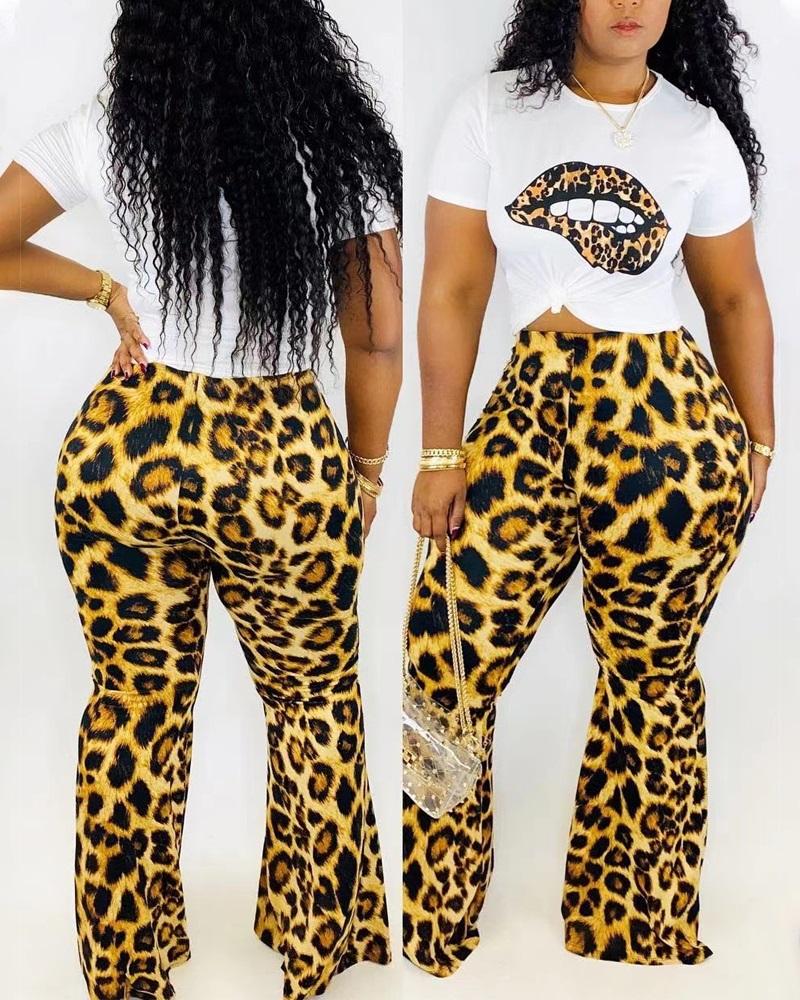 Plus Size Leopard Lip Print Casual Top & Flared Pants Set