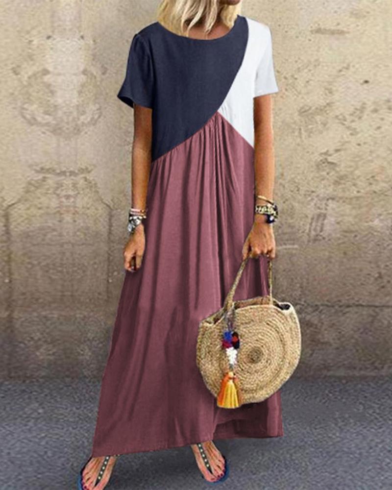 Style:Casual Type:Straight Material:Polyester Neckline:Round Neck Sleeve Style:Short Sleeve Length:Maxi Pattern Type:Colorblock Fit Type:Regular Occasion:Daily,Vacation Package Include:1* Dress