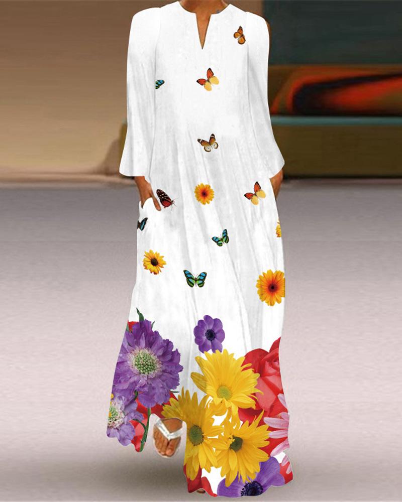Style:Casual Type:Straight Material:Polyester Neckline:V-Cut Sleeve Style:Long Sleeve Length:Maxi Pattern Type:Butterfly,Floral Fit Type:Regular Occasion:Daily,Vacation Package Include:1* Dress