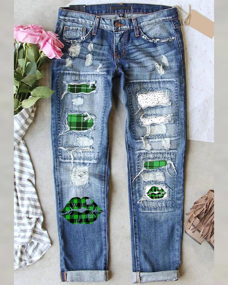 Plaid Lip Print Patchwork Ripped Jeans