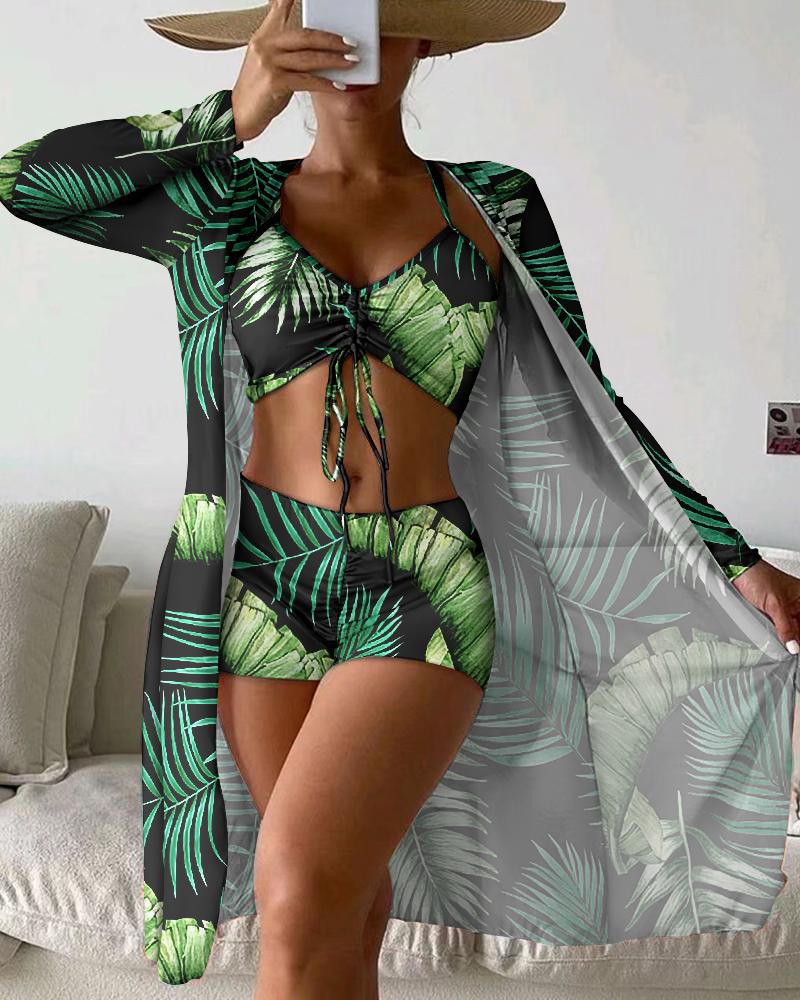 3PCS Tropical Print Drawstring Bikini Set With Cover Up