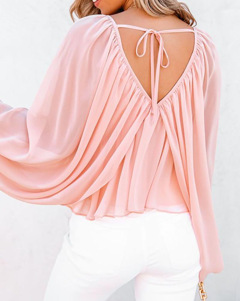Style:Chic Type:Blouses Material:100%Polyester Neckline:V-Neck Sleeve Style:Batwing Sleeve,Long Sleeve Length:Regular Pattern Type:Plain Decoration:Backless,Batwing Sleeve,Ruched,Tied Detail Fit Type:Regular Occasion:Daily Package Include:1* Blouse