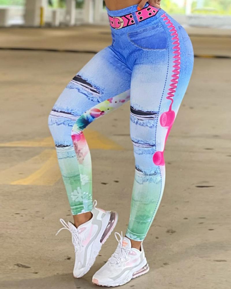 Women's Leggings Faux Denim Printed High Waist Skinny Active Pants