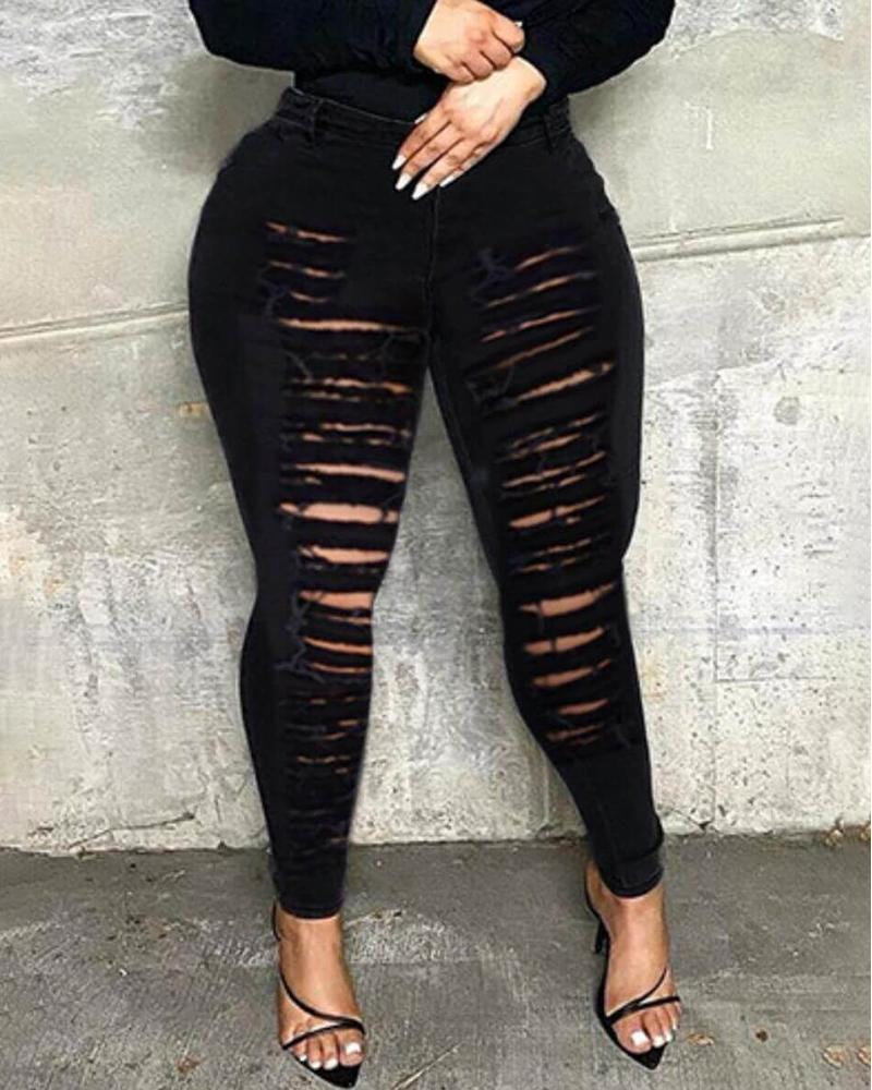 Style:Casual,Chic Type:Pants Material:Polyester Length:Long Pattern Type:Plain Decoration:Cutout,Ripped Fit Type:Skinny Occasion:Daily Package Include:1*Pants