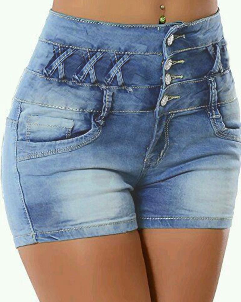 Style:Chic,Denim Type:Denim Shorts Material:Denim Length:Above Knee Pattern Type:Plain Decoration:Button,Pocket,Washed,Zipper Fit Type:Skinny Occasion:Daily Package Include:1*Denim Shorts
