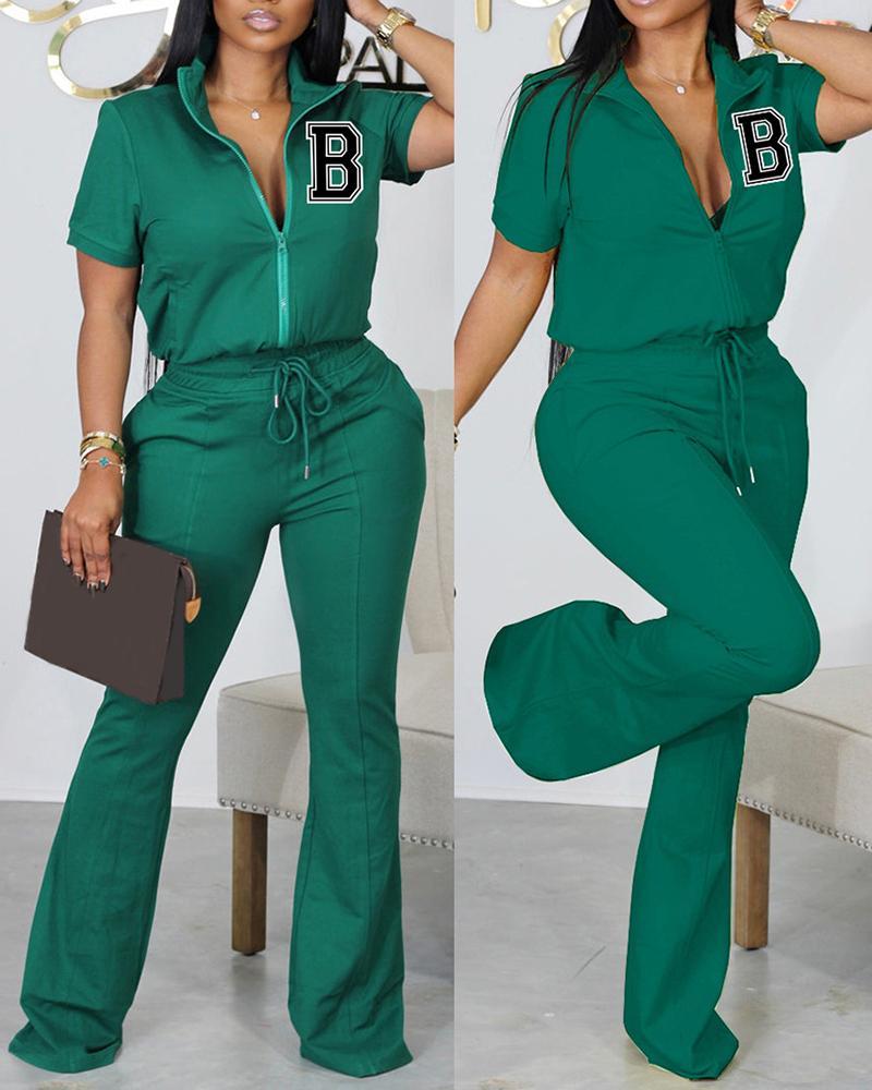Style:Casual,Chic Type:Pants Sets Material:Polyester Neckline:Stand Collar Sleeve Style:Short Sleeve Length:Long Pattern Type:Letter Decoration:Drawstring,Zipper Fit Type:Regular Occasion:Daily Package Include:Pants Sets