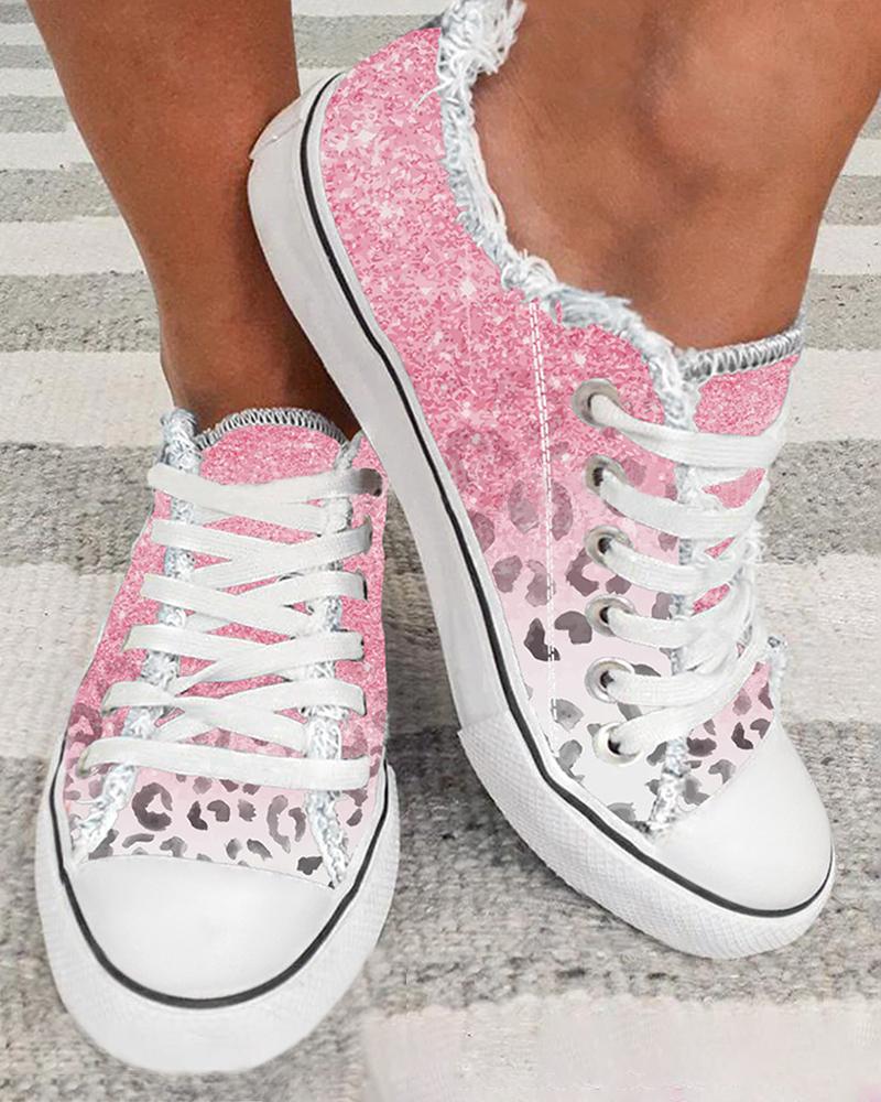 Valentine's Day Ombre Cheetah Print Lace-up Fringe Hem Canvas Sneakers